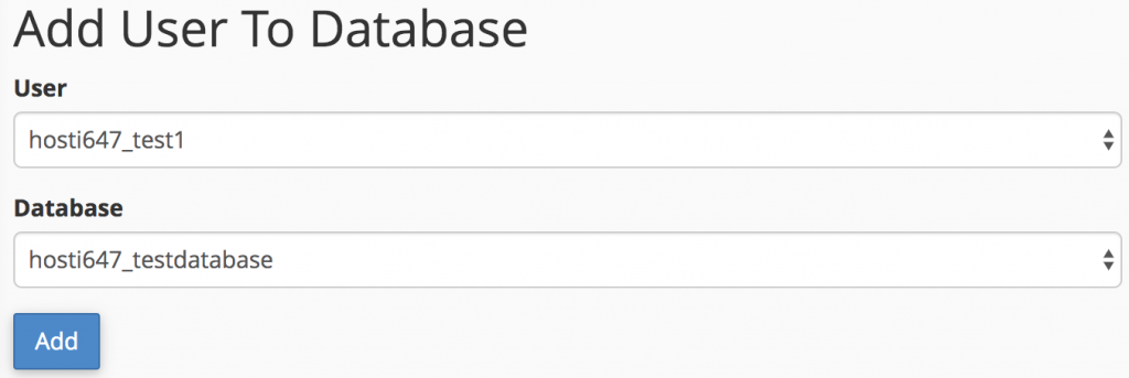After clicking Go Back, you can fill out the Add User To Database form. Select the user and the database to which the user will be allocated from the drop-down menu.