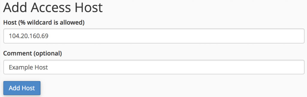 In the Host area, type the hostname or IP address. You can use your public IP address, to access the database from localhost. Alternatively, type a fully eligible domain name, such as www.jkucart.com, and then press Add Host.