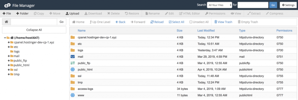 The File Manager is the tool you’ll need to handle your cPanel’s basic files. You can use it to create files and directories, assign permissions, and so on, in addition to uploading and removing files.