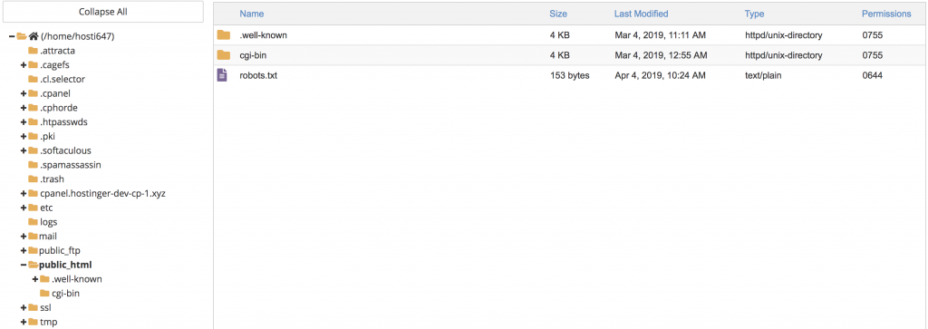 First, there’s a window section with a folder tree on the left and the contents of a folder on the right. By selecting the appropriate folder, you can navigate to it. Clicking the public html folder, for example, will show its contents –.well-known, cgi-bin, robots.txt, and so on.